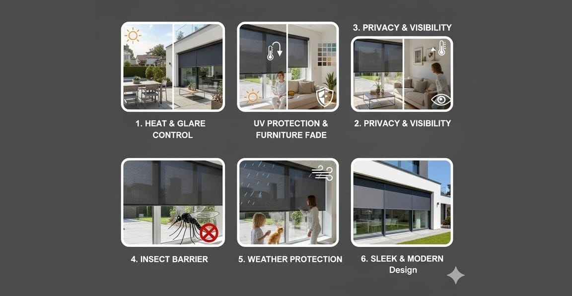 • Sunscreen fabrics reduce glare and UV protection, keeping interiors cool during summer.