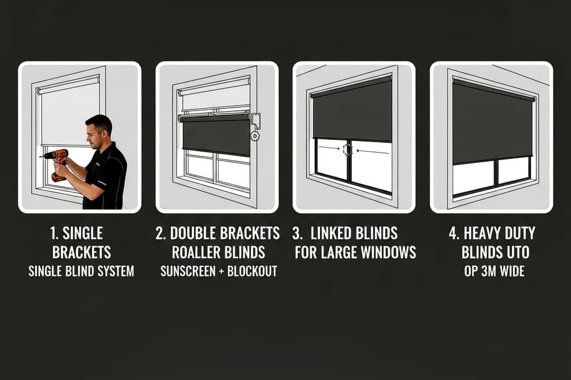 • Double brackets (dual roller blinds) – Combine sunscreen and blockout blinds on one bracket for ultimate functionality.