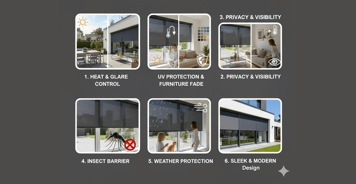 - Sunscreen fabrics reduce glare and UV protection, keeping interiors cool during summer.